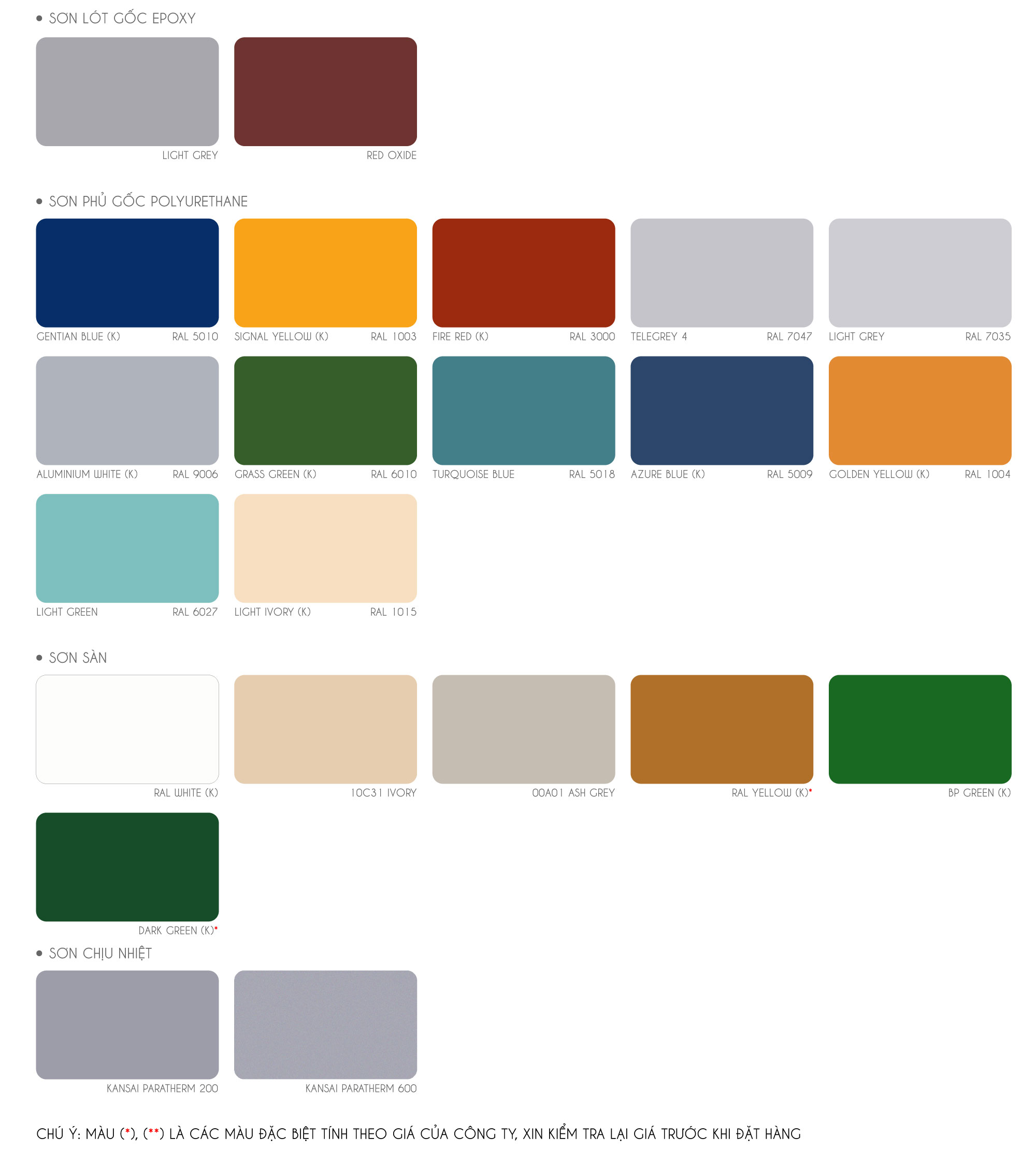 - Sơn nước đặc biệt Kansai: Kansai Sơn co giãn Weathercoat Elastomeric, Kansai Heat Reduction Roofcote – Sơn mái giảm nhiệt