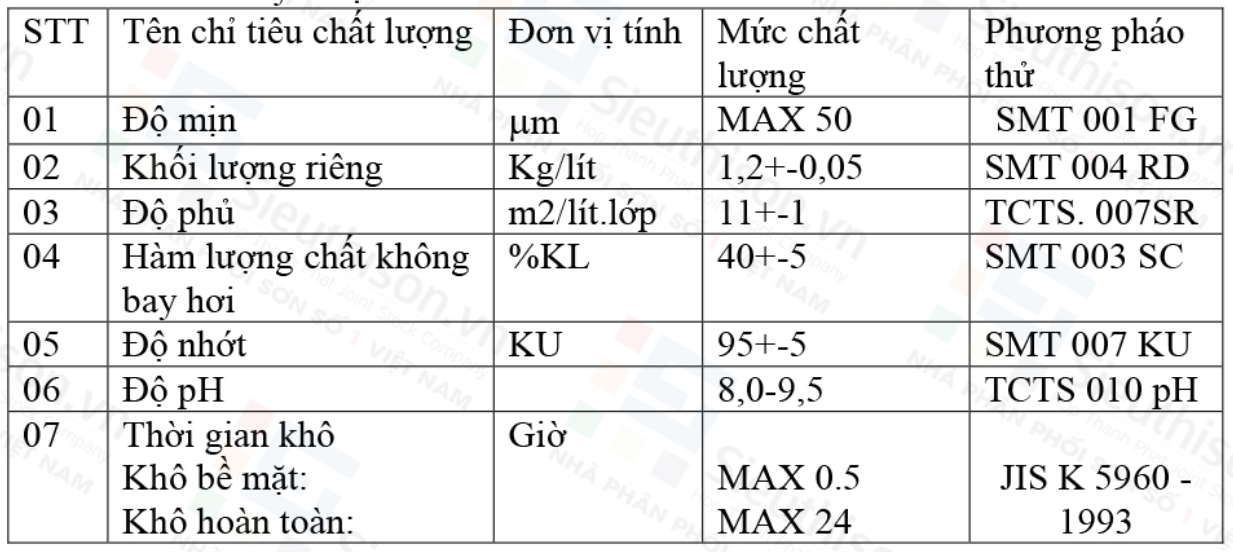 Là hỗn hợp sơn lót có chức năng che phủ chống hiện tượng kiềm hóa, phấn hóa do tạp chất từ tường xi măng, bê tông các công trình xây dựng, có các chỉ tiêu kỹ thuật chủ yếu: