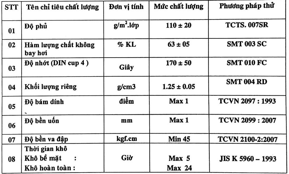 Là hỗn hợp hệ sơn dung môi có chức năng chống rỉ sét và bảo vệ bề mặt kim loại mạ kẽm dùng cho các công trình xây dựng có các chỉ tiêu kỹ thuật chủ yếu: