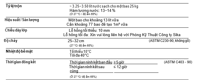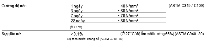 Giá trị về cường độ ghi trong tài liệu là giá trị trung bình được thực hiện trong phòng thí nghiệm. Kết quả thực tế ngoài công trường có thể thay đổi do sự khác nhau về môi trường, điều kiện bảo